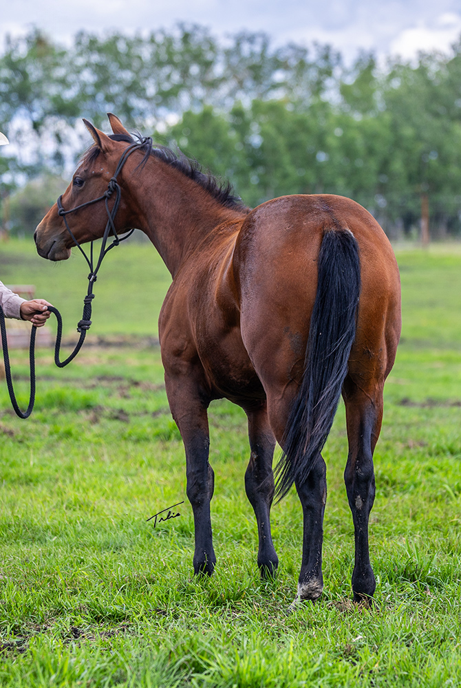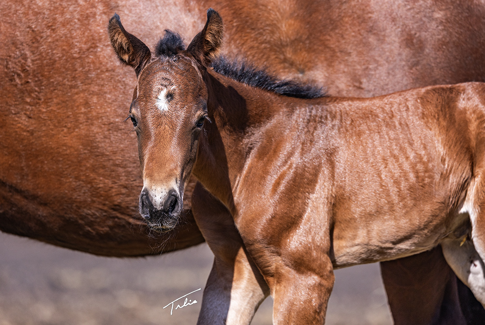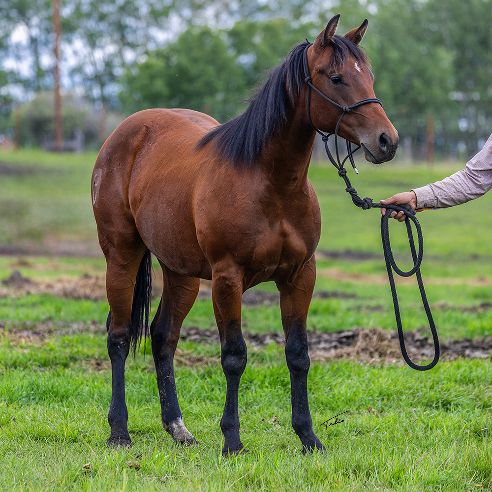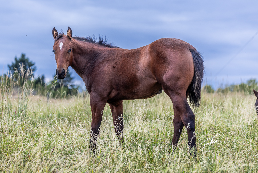 A beautiful dark bay filly with her dam's signature diamond-shaped star.