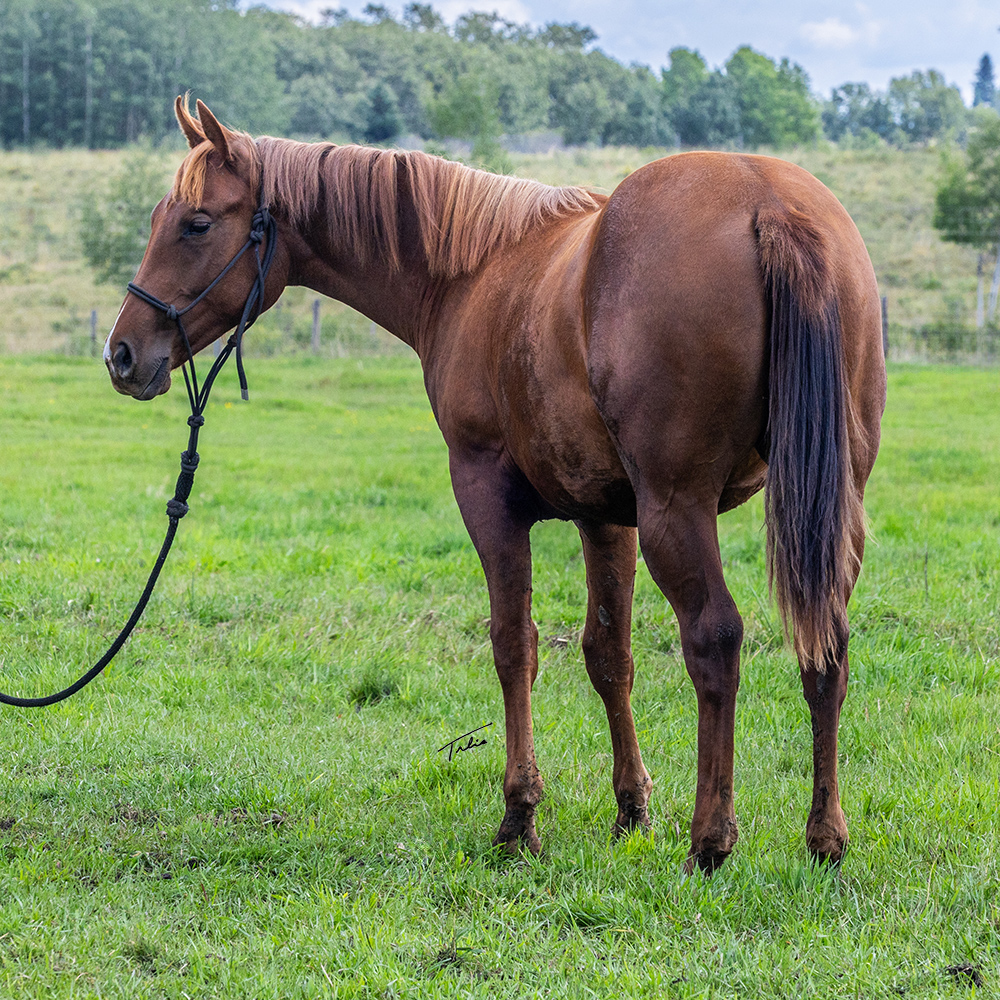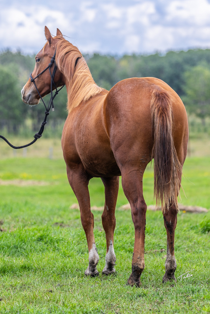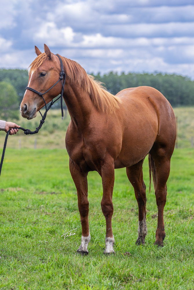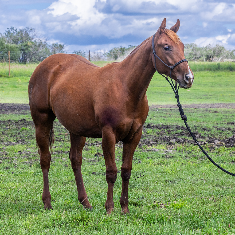A spunky chestnut rabicano filly with a large star and snip, and solid legs. Sired by our stallion Rockem Sockem Rey, out of a daughter of CJ Sugar Lena (LTE $183,768: NCHA Finals Non-Pro Champion; NCHA Non-Pro Classic/Challenge Reserve Champion; Sire of 30 RGP money-earners, 13 AQHA point-earners who have earned 356 AQHA points, $243,000 NCHA, and $12,200 NRCHA).