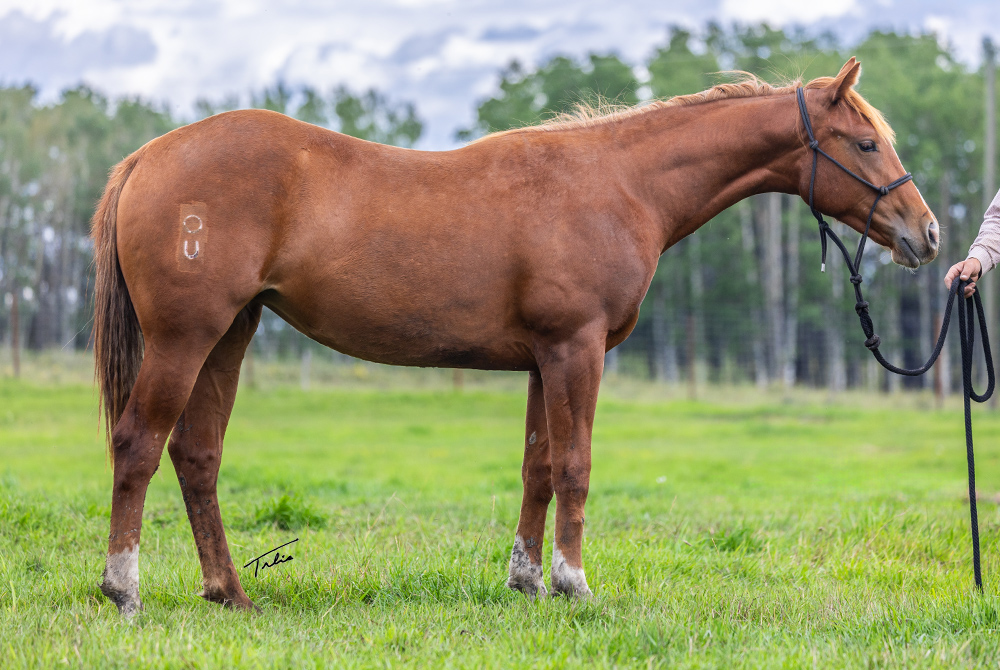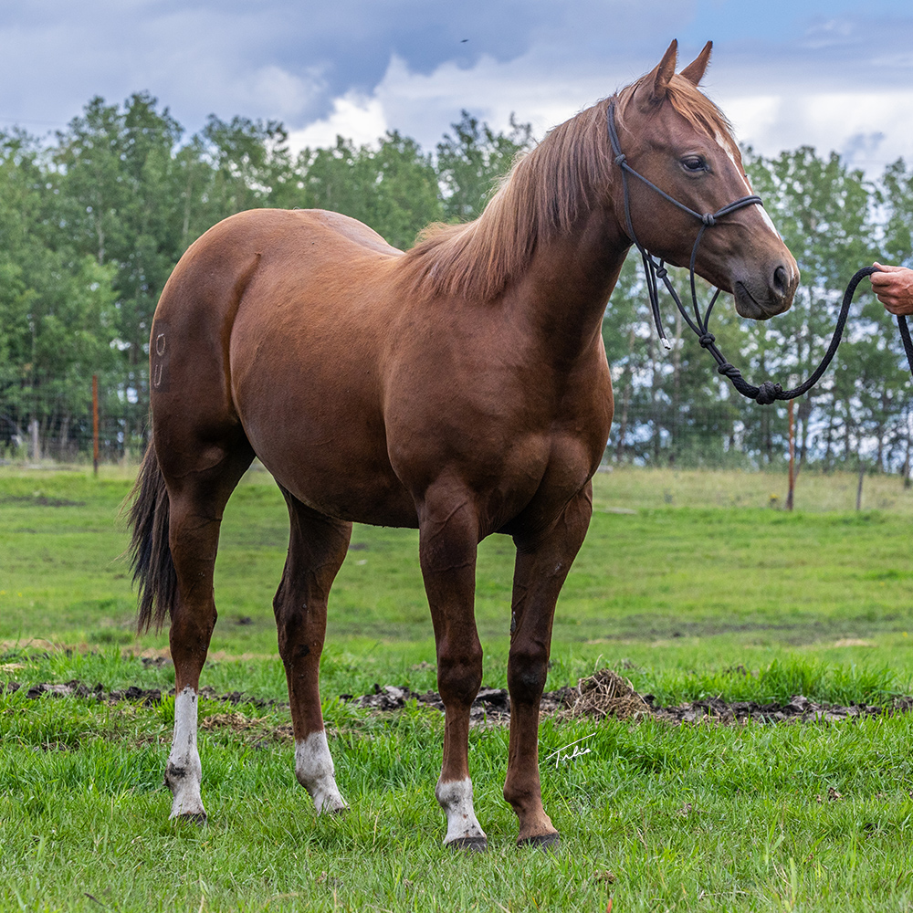 Won't lose this guy in a herd of sorrels with his wild chrome: An ultra-wide blaze with unique heart-shaped cutout, a half-blue eye, and two odd-angled socks on the right. Congratulations to Ross & Heather Beierbach on the purchase of this nice colt!